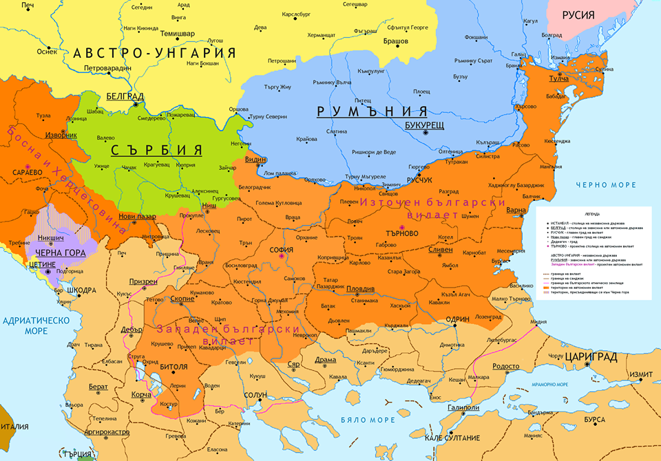 и Великите сили се връщат към проекта за България на две части. Този път границата между тези части няма да е вертикална, а хоризонтална, по линията на Стара планина. Границите на Княжество България и Източна Румелия са добре известни на всеки българин и не се нуждаят от коментар. Интересно е да се отбележи, че политическото устройство на Румелия доста наподобява формулата, договорена на Цариградската конференция през декември 1876 г.